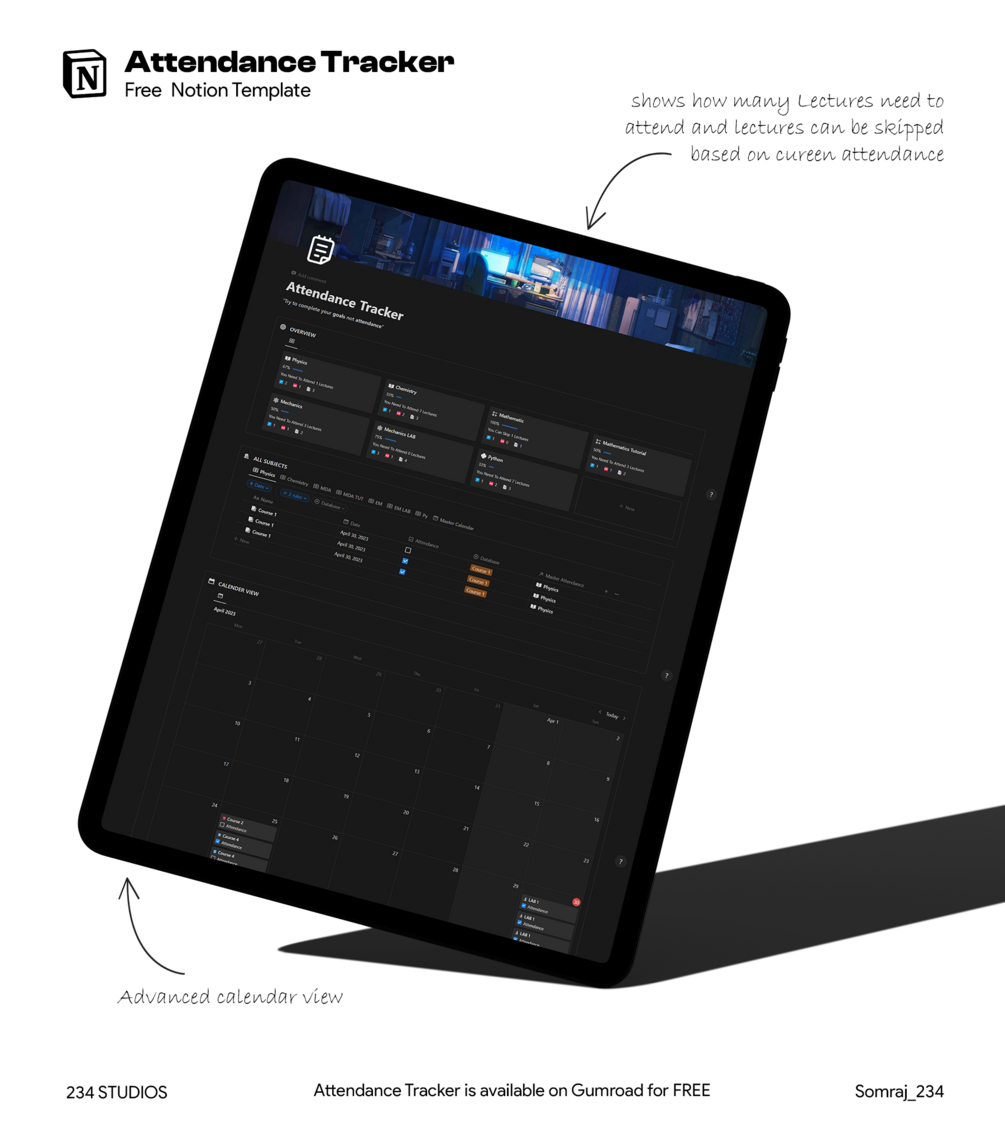 Introducing the Attendance Tracker Notion Template - the perfect tool for students and professionals who want to keep track of attendance in an organized and efficient manner.